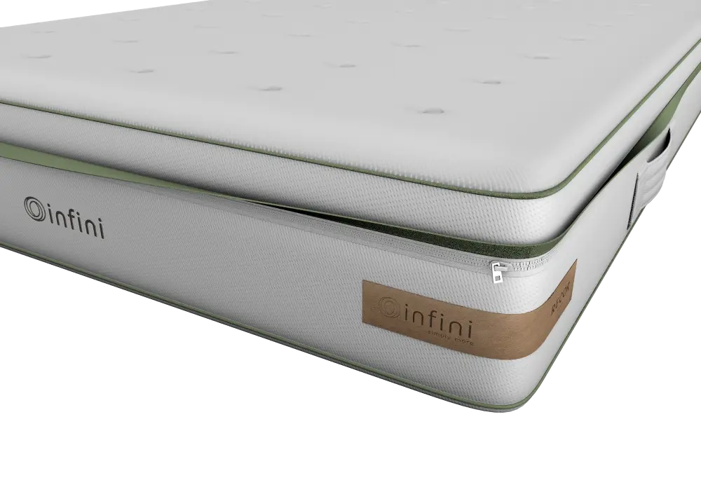 De INFINI matras bestaat uit een BASE (onderste gedeelte) en een TOP (bovenste gedeelte) die met elkaar verbonden zijn door een stevige rits. Je kan de BASE en de TOP losritsen en openleggen. Vervolgens kan je zowel de hoes van de BASE als de hoes van de TOP openen met een rits om de verschillende onderdelen goed te verluchten of makkelijk te vervangen.